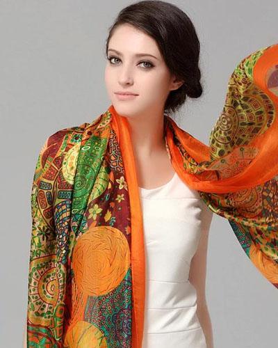 這款桑蠶絲圍巾顏色非常亮麗,圖案也是絢爛紛呈,雖然有些繁復,但卻很顯活力呢!采用了原生態印染,不傷害桑蠶絲品質,手感更加柔軟,質地更加細膩!穿著非常華麗,而且很透氣呢!這樣的桑蠶絲圍巾格外迷人,深得都市女性青睞!