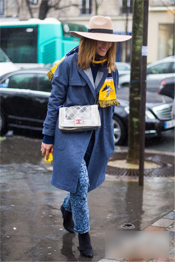 藍色外套,配上黃藍圍巾,黃色色彩絢麗,在暗淡的秋冬季節(jié)增添一抹炫麗色彩。