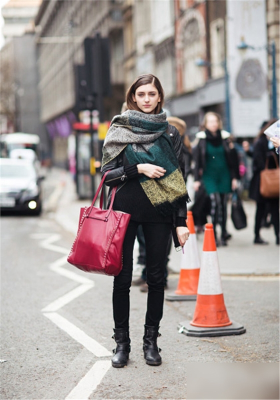 黑色皮質外套搭配黑色毛衣,下身是黑色緊身褲與黑色金屬扣飾短靴,紅色休閑皮包,毛毯披肩的加入,讓整個造型更添冬日氣息,增加色彩元素。