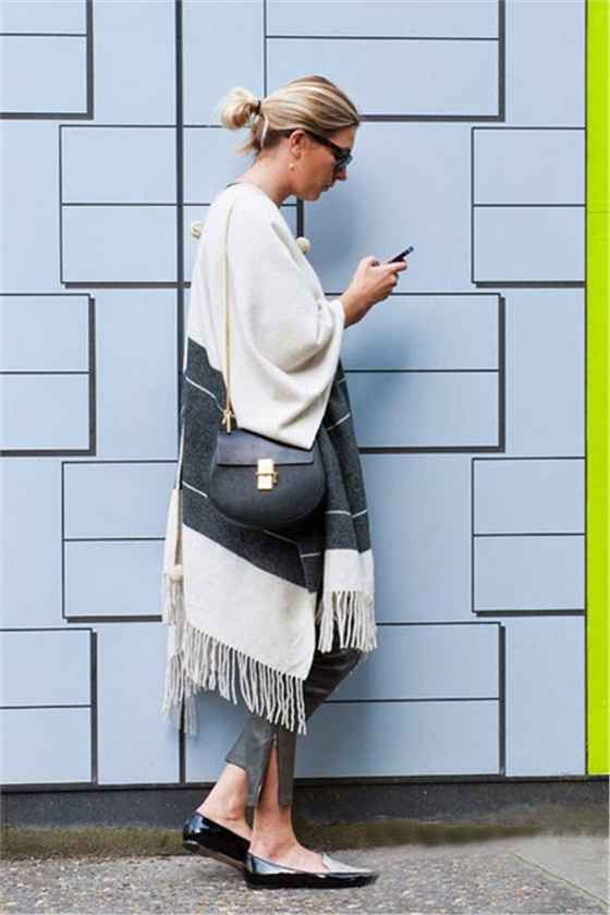 搭配示范3:流蘇大披肩+防水臺(tái)粗跟鞋+小禮帽,甜美盡現(xiàn)。